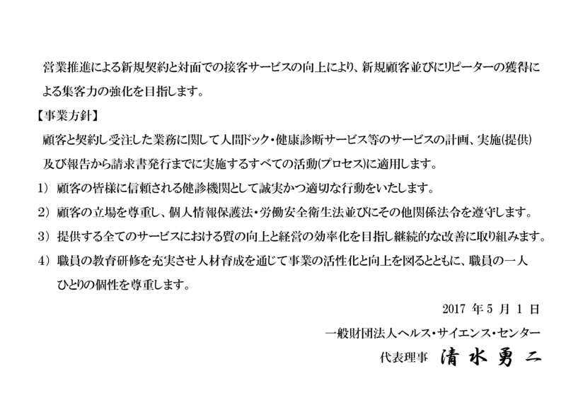 一般財団法人ヘルス・サイエンス・センター(以下「当法人」と称す)は、顧客と契約し受注した人間ドック・健康診断業務等で取り扱う「情報資産」を多様な脅威から保護することが重要な責務であると認識し、当法人が取り扱う情報資産の適切な保護対策を実施します。