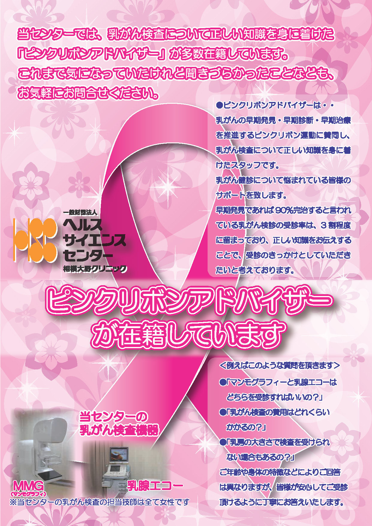 当センターでは、乳がん検査について正しい知識を身に着けた「ピンクリボンアドバイザー」が多数在籍しています。