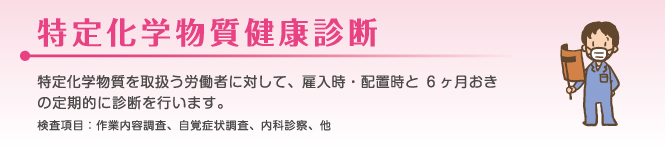 基本項目の作業内容・自覚症状調査・内科診察と、使用物質や業務の種類によって尿検査・胸部X線検査等、検査項目が変わります。